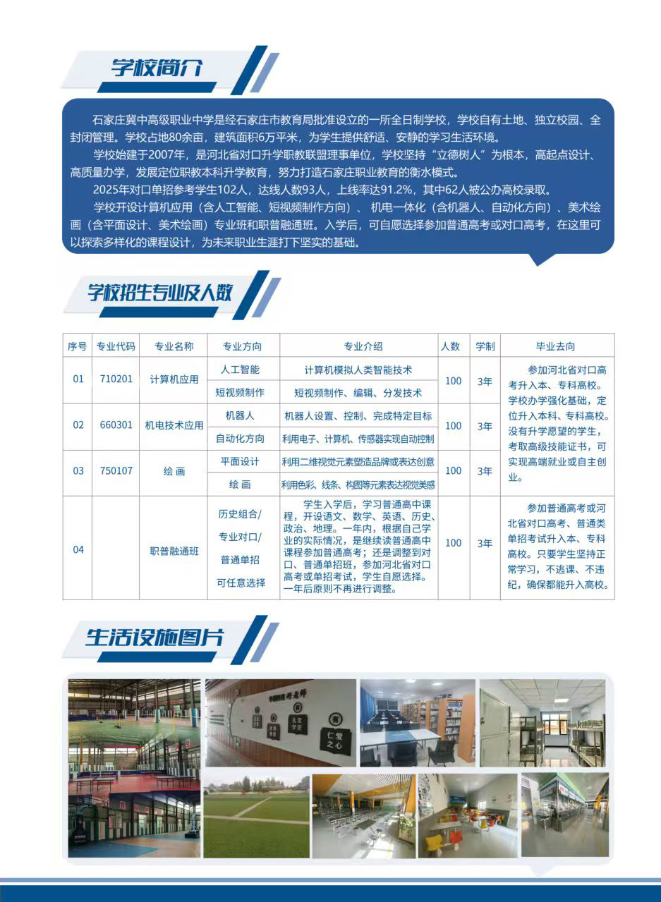 石家庄冀中高级职业中学是经石家庄市教育局批准设立的一所全日制学校,学校自有土地、独立校园、全封闭管理。学校占地80余亩,建筑面积6万平米,为学生提供舒适、安静的学习生活环境。